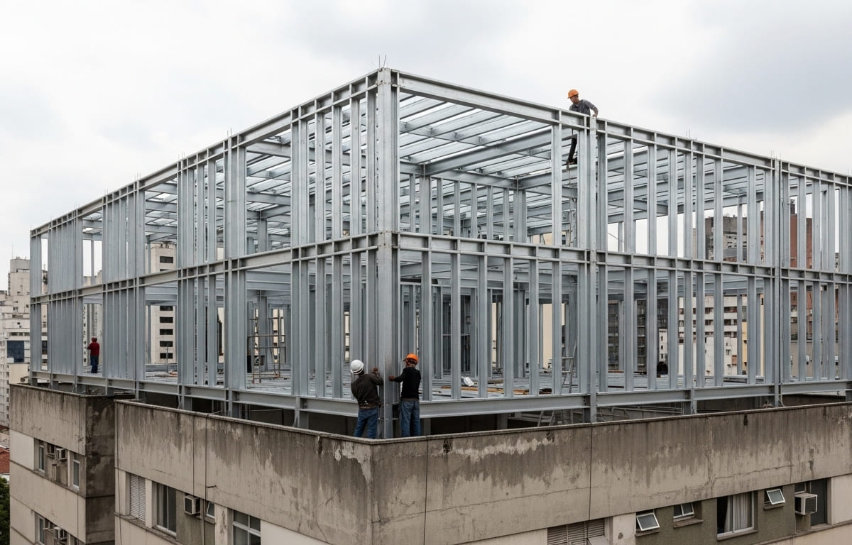 Por ser um sistema leve, o Steel Frame é ideal para criar novos andares ou quartos sobre estruturas já existentes, sem sobrecarregar a fundação original.